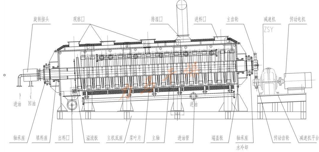 設備的核心是兩根空心軸和焊在軸上的空心攪拌槳葉。槳葉形狀為楔形的空心半圓形,可以通入加熱介質。除了起攪拌作用外,也是設備的的傳熱體。槳葉的兩主要傳熱側面成斜面,因此當物料與斜面接觸時,隨著葉片的旋轉,顆粒很快就從斜面滑開,使傳熱表面不斷更新,強化了傳熱。在槳葉的三角形底部設有刮板,以將沉積于殼底的物料刮起,防止產生死角。